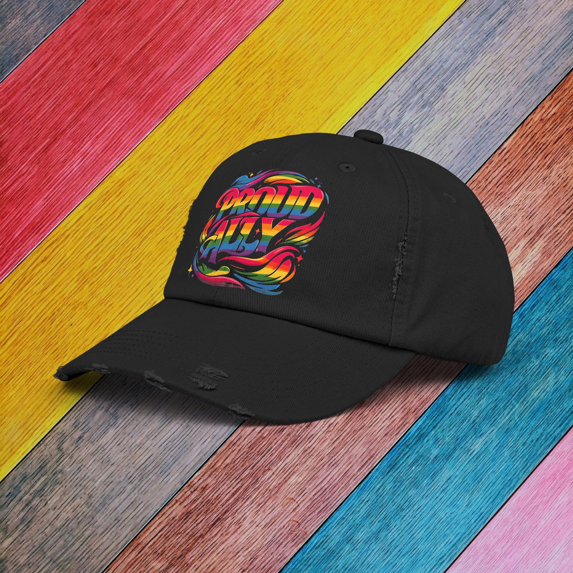 A 'Proud Straight Ally' Gay Pride Distressed Cap for those in the straight community who want to show support for the LGBTQIA community. This cap gives off a vibe of inclusivity and support, perfect for allies looking to make a statement. Ideal for Pride events, LGBTQIA celebrations, or everyday wear for those advocating for equality.