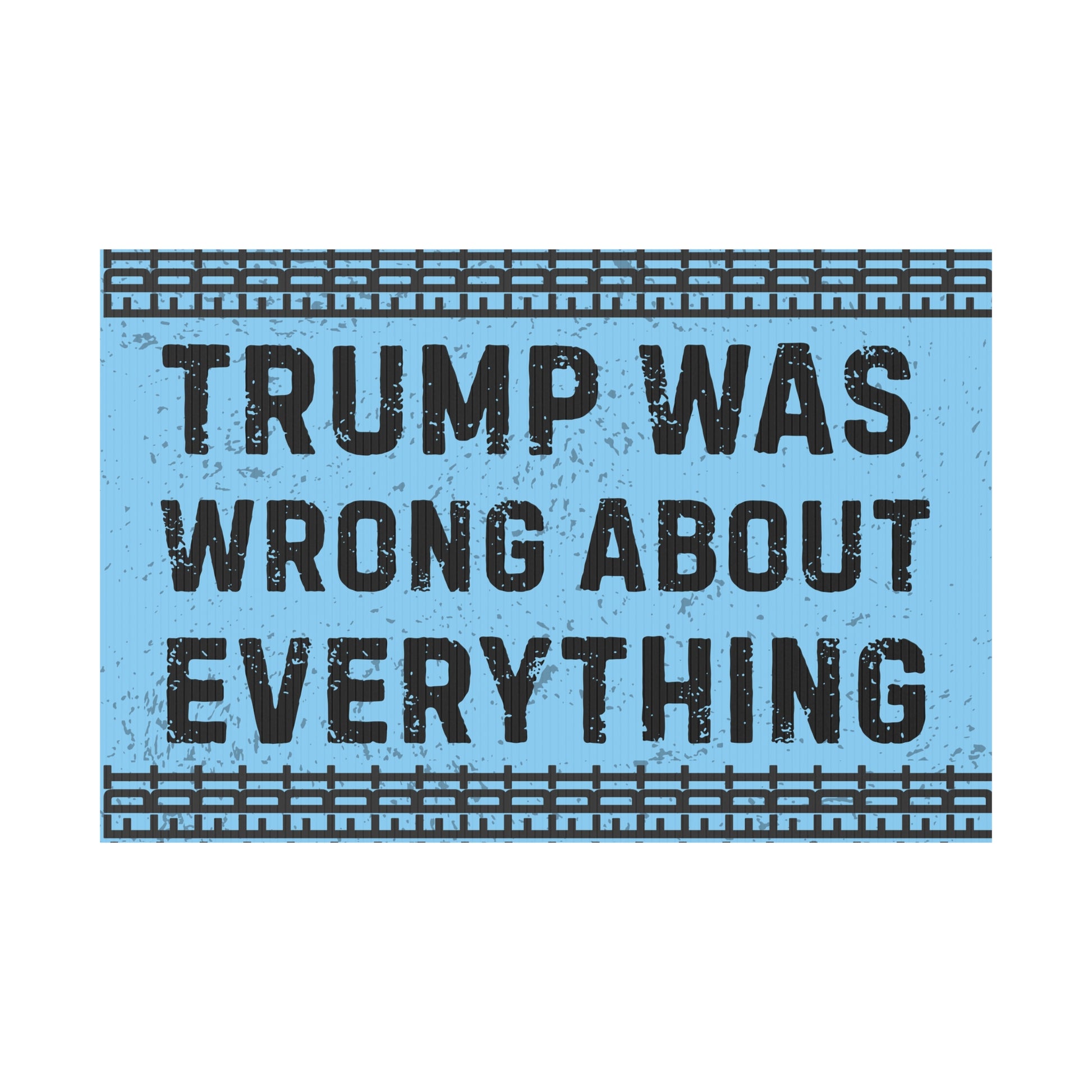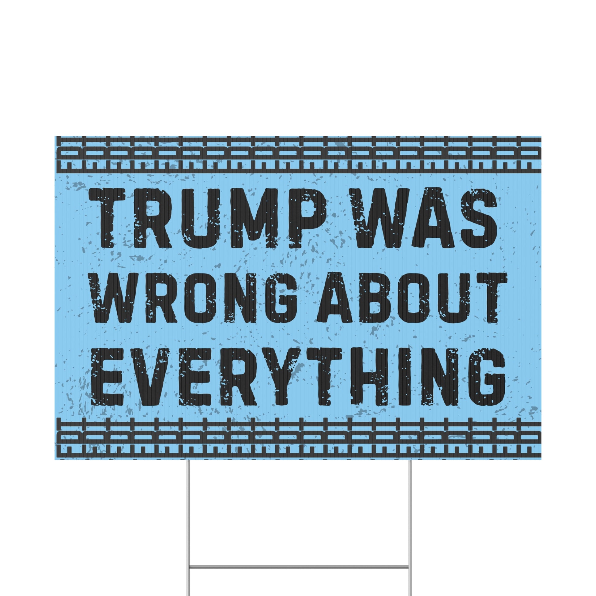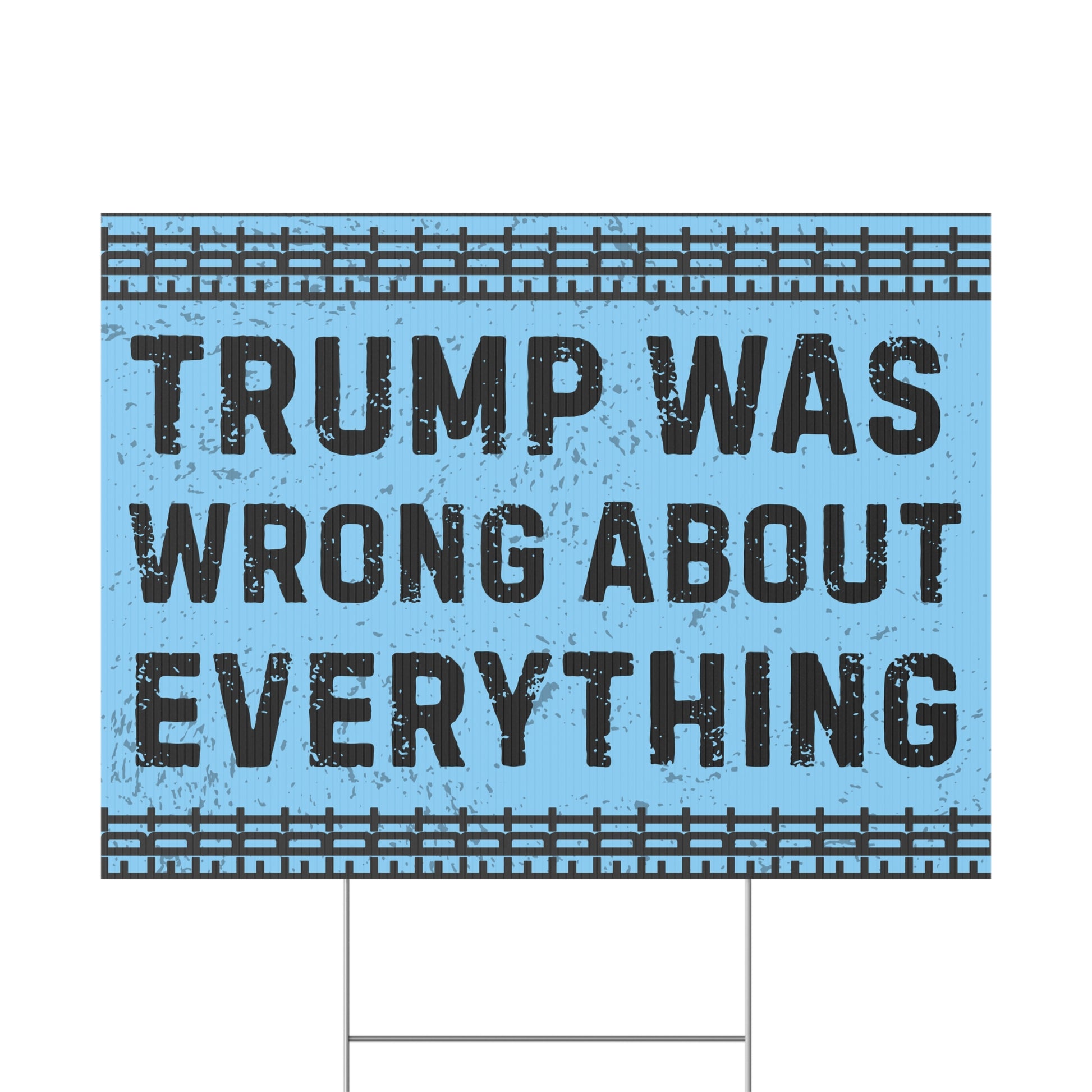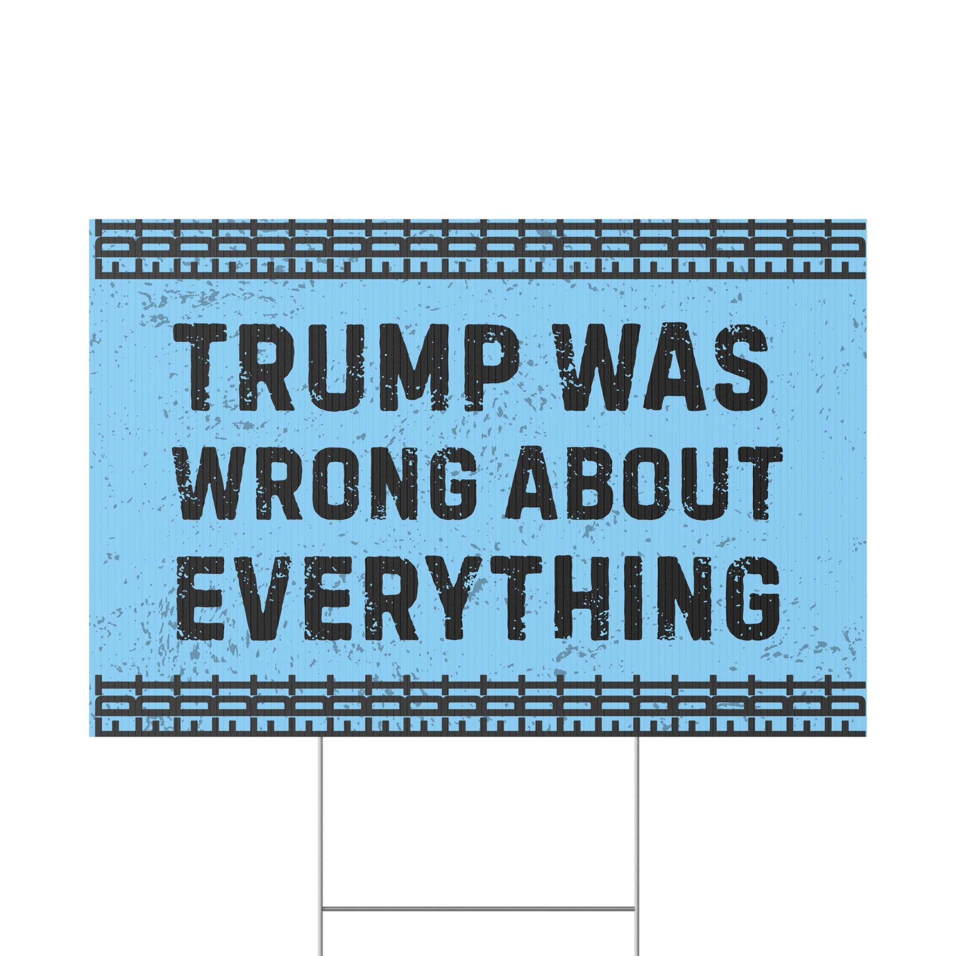 Make a bold statement with this "Trump was wrong about everything" yard sign. Perfect for outdoor use, this durable plastic sign comes with a metal stake for stability. Show your beliefs in style and stand out in your neighborhood. Ideal for those who want to express that hey will not bow down to tyranny.
